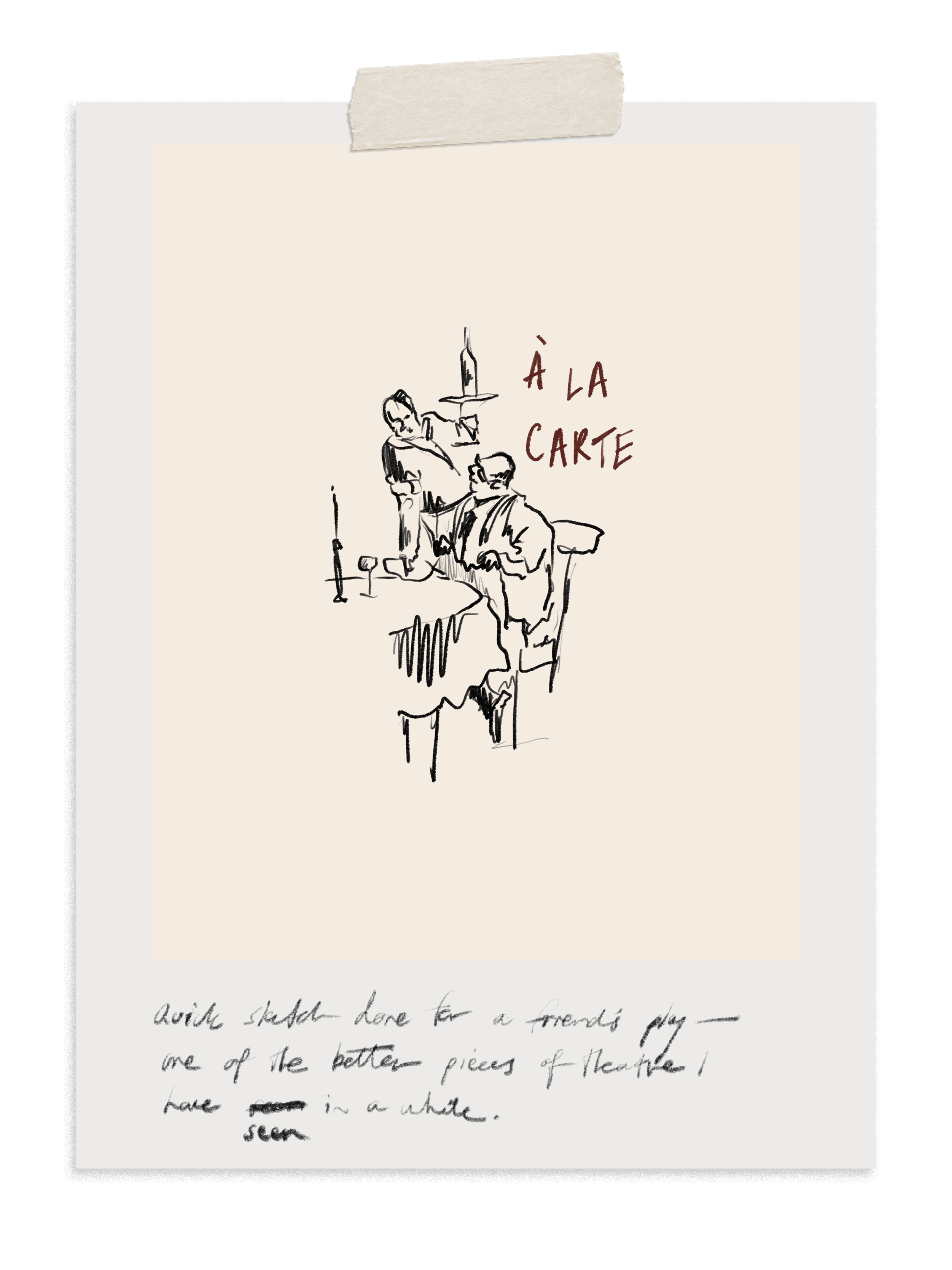 À la carte | a sketch for a play Apr 11 Written By Reinette Roux Done in collaboration with theatre actor and director Lucy Rossen.A sketch done for a play. Reinette Roux